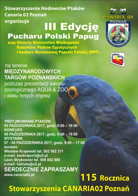 Stowarzyszenie Hodowców Ptaków Canaria 02 Poznań zorganizowało trzecią już edycję Pucharu Polski Papug, oraz - tak jak w roku poprzednim - Otwarte Mistrzostwa Wielkopolski Kanarków i Ptaków Ezgotycznych. Nowością było przeprowadzenie osobnego Konkursu Wystawowej Papużki Falistej.