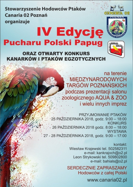 W dniach 25-28.10.2018r. w Poznaniu podczas trwania rodzinnego weekendu Aqua&ZOO i Hobby 2018 na terenie Międzynarodowych Targów Poznańskich, w hali nr 11 odbyła się IV Edycja Pucharu Polski Papug oraz Otwarty Konkurs Kanarków i Ptaków Egzotycznych, organizowany przez Stowarzyszenie Hodowców Ptaków CANARIA 02 POZNAŃ.
